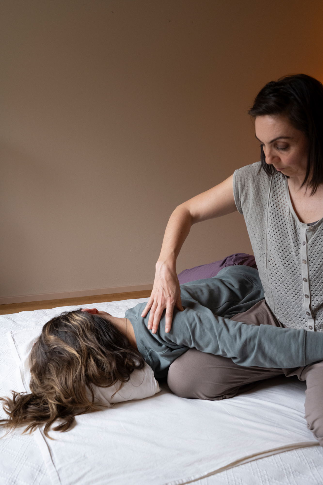 Keine Behandlung verläuft genau gleich. Je nach Bedürfnis wird sehr fein und still, oder dynamisch und tief mit dem Körper gearbeitet. Mit sanftem Druck von Daumen, Handflächen, Ellenbogen und Knie werden Akupunktur-Punkte und Meridiane behandelt.